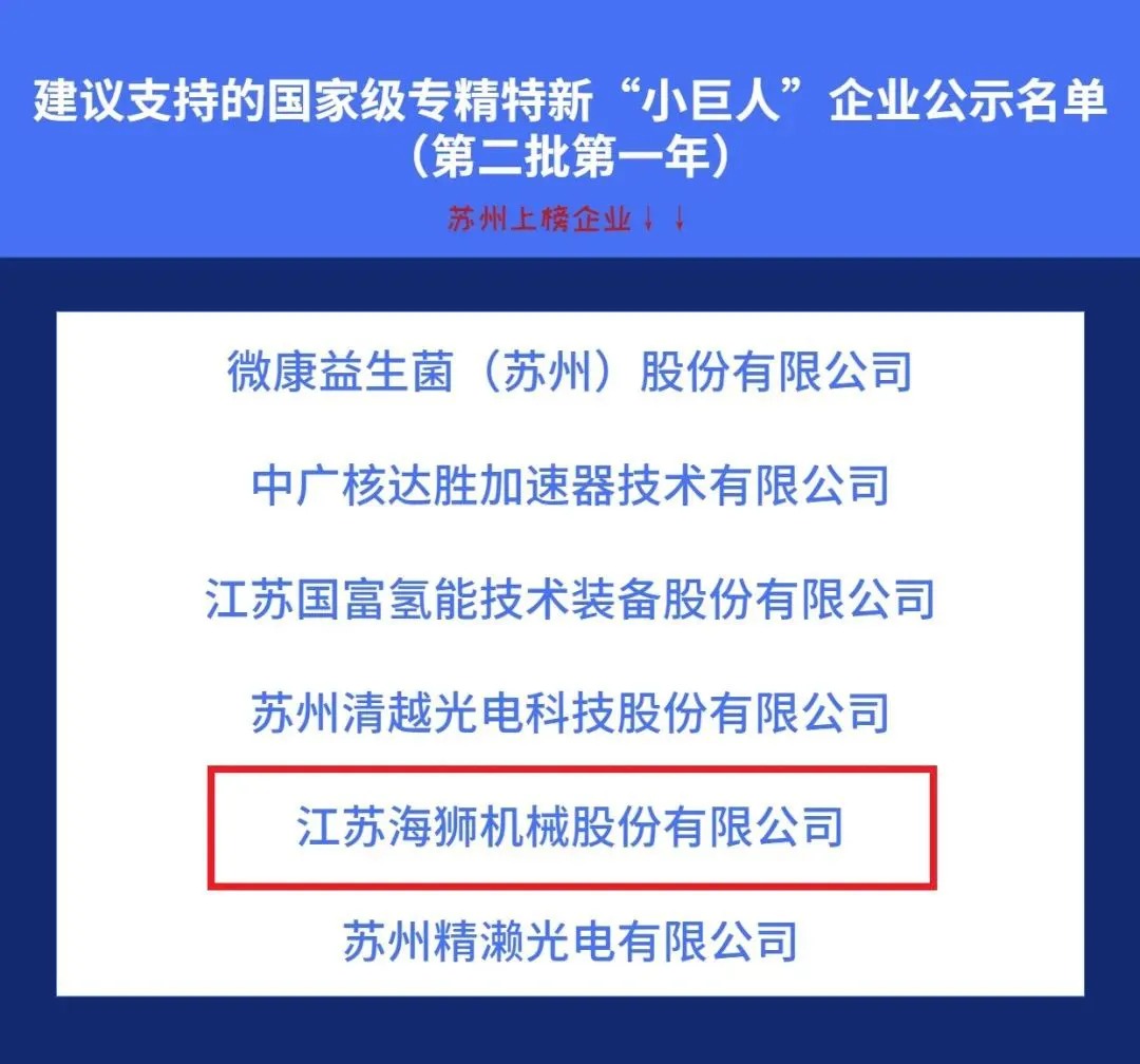 近日,工信部公示了建議支持的第二批第一年國家級專精特新“小巨人”企業名單中,江蘇海獅機械股份有限公司榜上有名!