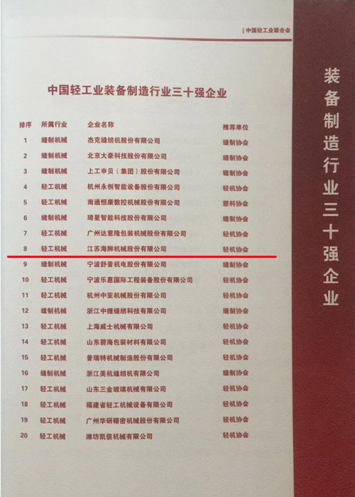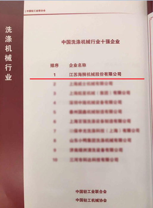 今日江蘇海獅機械股份有限公司榮獲了中國洗滌機械行業十強首位,中國輕工業裝備制造行業三十強企業第8位,中國輕工業科技百強企業第23位
