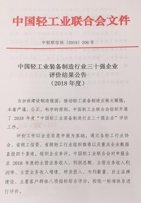 為加快建設強國,推動輕工裝備制造業做大做強,本著嚴謹、公正、科學的原則,中國輕工業聯合會組織開展了2018年度“中國輕工業裝備制造行業三十強企業”、“中國輕工業科技百強企業”評價工作。