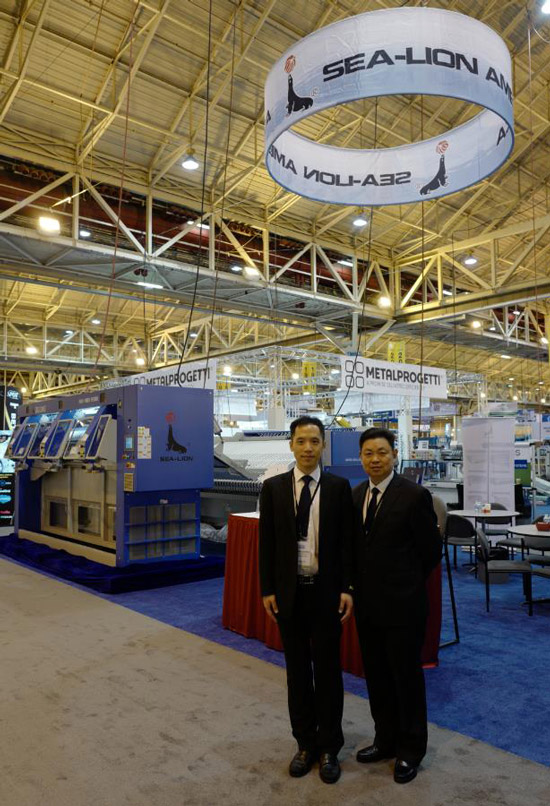 At that day ,Jiangsu Sea-lion Machinery Co.,Ltd general manager Wu shixin and executive deputy general manager Zhang jianfeng led the team ,showed XGQ-100CFQ automatic washer extractor、ZD3300-VB high speed flatwork folder、ZBQ3300III three station feeder .