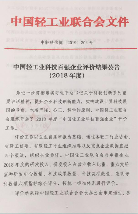 In order to accelerate the strong country construction and promote the development of the light industrial equipment manufacturing industry ,in the principle of preciseness, fairness and science ,the China light industry federation has organized the evaluation of “top 30 enterprises in Chinese light industrial equipment manufacturing industry” and “top 100 enterprises in Chinese light industrial technology industry” in 2018 .